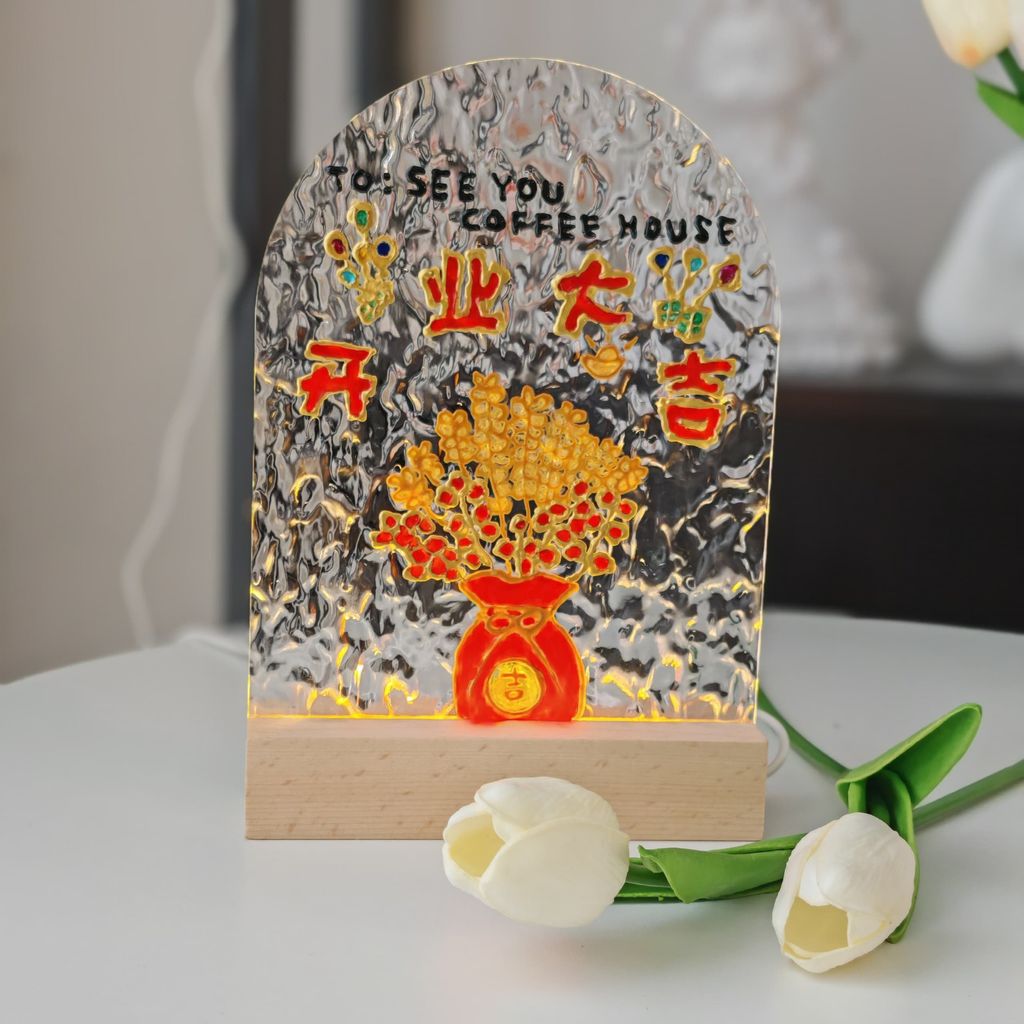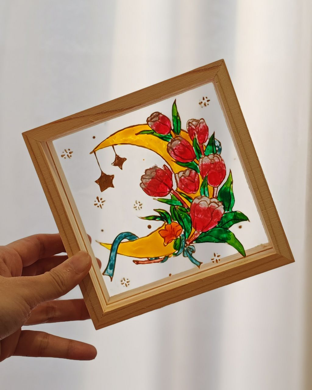 你将获得一块透明玻璃画板、专用玻璃颜料与描边工具,